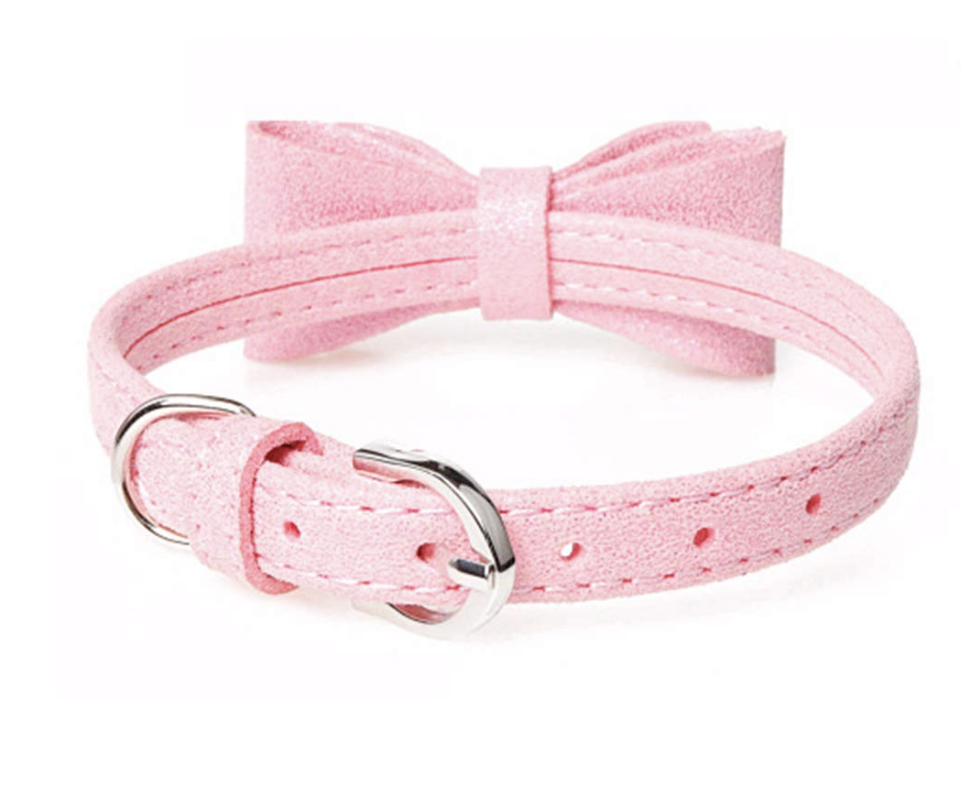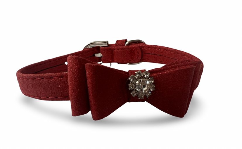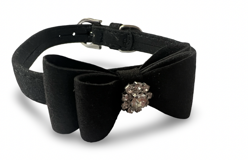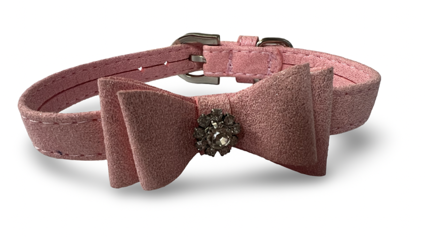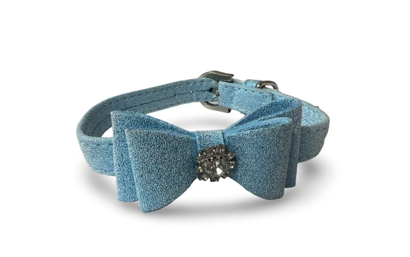 Soft Pearlescent Faux-Suede collar featuring a double-bow with a central crystal design.